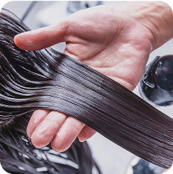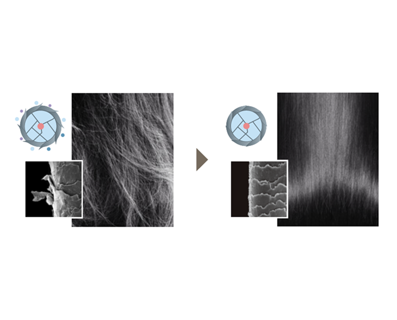 湿気によるうねりや広がり、くせ毛に対し、毛髪内部の水分を保ちながらしっとりとつややかな仕上がりに。
